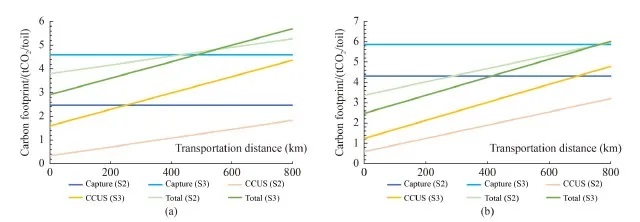 图 6 (a) S2和(b) S3情景下基于CCUS的ICL工艺的碳足迹。