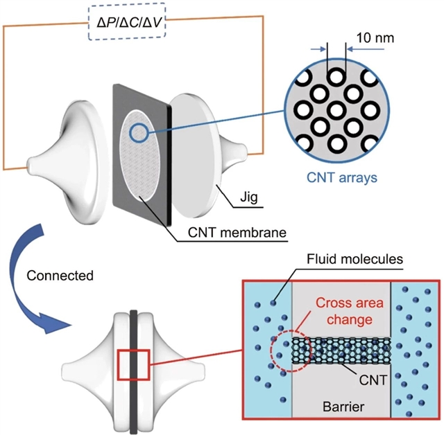图1. 可能导致碳纳米管中流速增大的实验装置示意图。ΔP/ΔC/ΔV:压力/浓度/电压差。