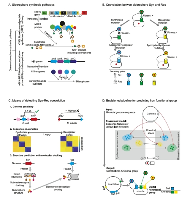 图2. 基于基因组序列的数字化铁载体分型。A. 两种主要的铁载体合成途径概述:非核糖体肽合成酶(NRPS)途径(上)和非NRPS铁载体(NIS)合成途径(下)。约70%的微生物铁载体由NRPS途径合成,约30%由NIS途径合成。B. 铁载体和其识别受体之间结构共进化的选择压力示意图。C. 检测铁载体合成酶与识别受体共进化的三种计算方法:基因组邻近性分析;序列协变分析;结合分子对接的结构预测方法。D. 从微生物基因组预测铁功能群的可能流程。“铁功能群”可以用二元向量表示,用于识别每个菌株产生和利用的铁载体类型。