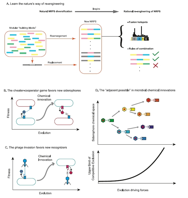 图4. 铁载体多样化的进化和分子基础及其意义。A. 铁载体多样化如何启发NRPS的理性重编程。自然界中NRPS的多样化过程,如模块化部件的重排和替换,启发了NRPS的理性合计,通过理解重组热点和组合规则来创造新的产物。B. 生产者-偷盗者的博弈如何促进新铁载体的产生。上图中展示了偷盗者和生产者之间的博弈如何驱动新铁载体锁钥对的出现。C. 噬菌体选择压力如何促进新识别受体的形成。图中展示了噬菌体入侵如何驱动识别受体的改变和新铁载体锁钥对的形成。D. 微生物化学创新中的"邻近可能性"概念。上图展示了一个已有的铁载体锁钥对(绿色类型)如何在某些进化驱动力下扩展到其邻近可能空间(不同颜色)。下图展示了这种铁载体多样化如何提升竞争排除定律的上限。