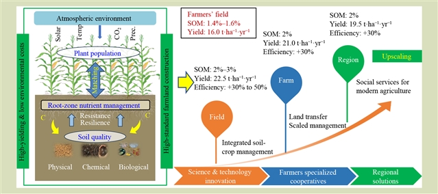 在耕地资源约束下,提高单产成为保障粮食需求的关键。华北平原冬小麦-夏玉米轮作系统具有显著高产潜力,部分区域已实现22.5 t·ha-1的年产量目标,相当于该地区最高纪录 (28.1 t·ha-1) 的80%。然而大部分地区仍存在显著产量差距。实现该轮作系统的大规模生产潜力对保障国家粮食供给具有战略意义。该地区农业生产同时面临地下水超采、土壤质量退化、化肥过量施用及气候变化等多重挑战,亟需通过土壤-作物系统综合管理推动农业向可持续方向转型。