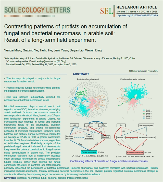 微生物残留物在土壤有机碳(SOC)形成过程中起着至关重要的作用。然而,驱动微生物残留物累积的生物和非生物因素还不清楚,尤其是原生生物与真菌/细菌之间的相互作用如何影响真菌和细菌残留物的累积有待深入研究。本研究基于27年长期施肥定位试验,结合高通量测序与氨基糖分析,旨在阐明长期施肥下微生物残体对SOC累积的贡献特征,以及微生物属性特别是原生生物与真菌/细菌间的营养互作调控微生物残体形成的机制。结果表明:真菌残留物对SOC的平均贡献率为32.4%,高于细菌残留物的14.6%。对原生动物-真菌互作网络的模块化分析表明,子囊菌真菌是农田土壤中真菌残留物的主要贡献者。原生生物抑制真菌残留物的累积,其机制是直接分解真菌残留物,而非改变真菌群落结构。相比之下,细菌残留物与细菌丰度呈正相关关系。原生生物通过提高细菌数量促进了细菌残留物的形成。此外,土壤全氮对细菌残体的固存有很大影响。总体而言,原生生物通过分解真菌残留物或者改变细菌丰度来调节农田土壤中微生物残留物的累积。这项研究强调了原生生物在SOC形成过程中关键作用,对改进农田生态系统长期固碳潜力的预测具有重要意义,有助于在全球气候条件下加深对陆地碳循环过程的理解。