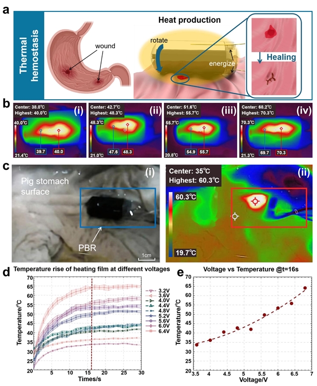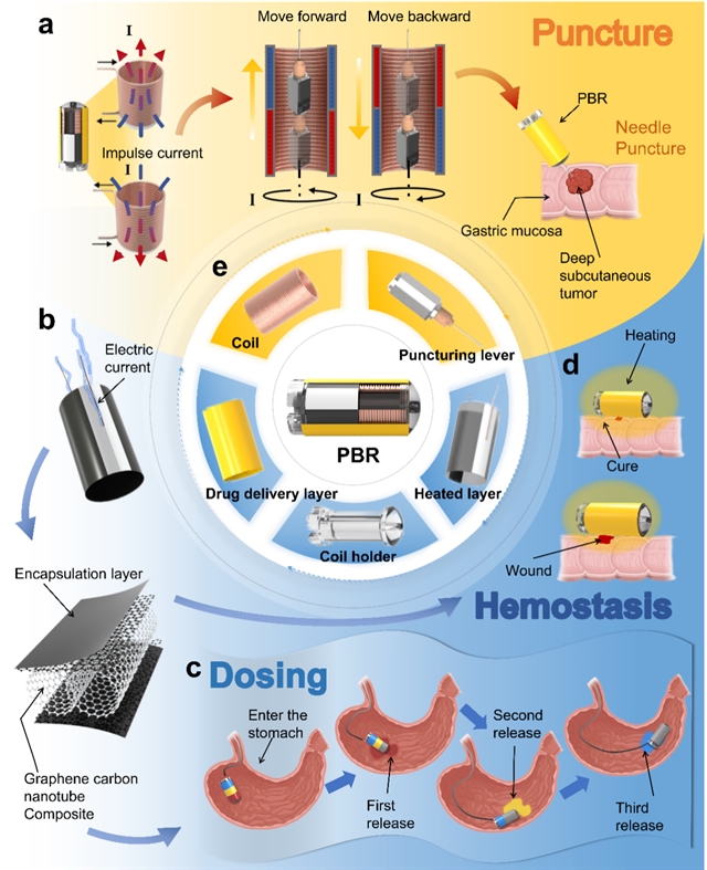 图1.PBR的结构组成、应用原理以及可实现功能。(a)PBR的穿刺结构、原理及穿刺场景演示(b)PBR发热层发热原理;(c)PBR的三段式多点给药过程;(d)PBR热止血功能演示;(e)PBR的结构组成。
