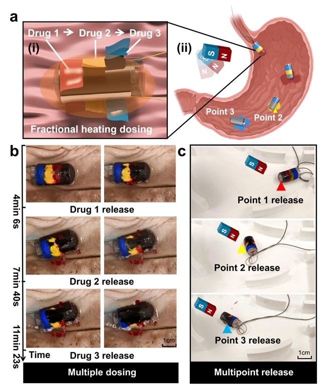 图4.PBR三段式多点给药功能:(a)机器人的给药模块示意图;(b)猪胃中给药的生物实验;(c)运动过程中给药。
