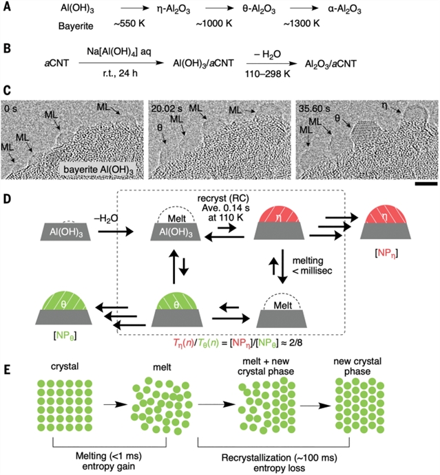 本研究首次揭示,氧化铝的两种晶型(η型和θ型)在纳米级别可以在极短时间内快速互相转换,不同于传统认为的单向不可逆的过程。这一现象主要受到表面能的影响,使得两相的能量差变小,导致它们可以在短时间内处于准平衡状态,并进行随机转换。