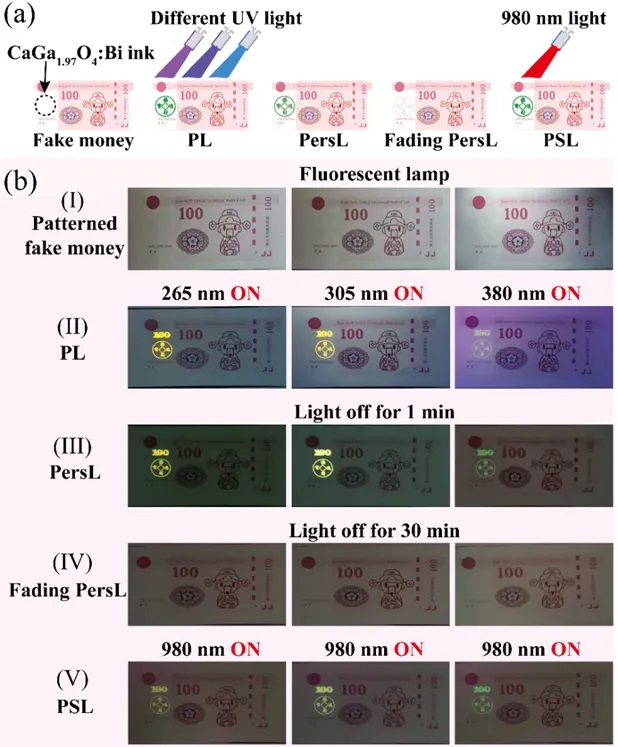 研究团队模拟荧光防伪标签,通过选择激发波长、辐照时间和光激励发光模式。可以在模拟货币上实现动态的光学防伪信息写入与读取(图3)。此外,团队通过对比市面上各种类型的荧光油墨,揭示所制备的多色长余辉荧光油墨表现出优异的动态加密属性。