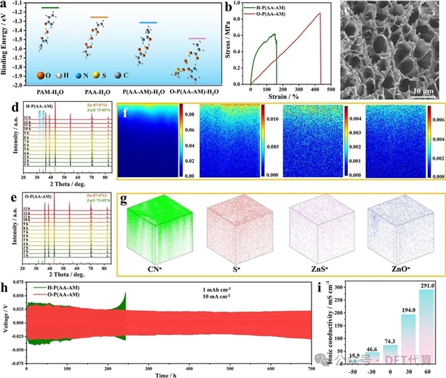 图4. 有机水凝胶电解质表征。(a) 水分子与不同聚电解质骨架相互作用的DFT计算结果;(b) H-P(AA-co-AM)与O-P(AA-co-AM)的应力-应变曲线;(c) 冻干O-P(AA-co-AM)的SEM形貌;(d,e) 对称Zn||Zn电池循环后锌阳极的XRD谱(分别采用H-P(AA-co-AM)和O-P(AA-co-AM)电解质);(f,g) 采用O-P(AA-co-AM)电解质体系循环12次后CN?、S?、ZnO?等物种的TOF-SIMS二维截面分析及三维重构图像;(h) 采用O-P(AA-co-AM)的对称电池循环性能(10 mA cm?²);(i) 不同温度下电解质离子电导率。