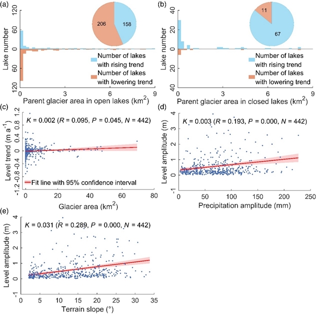 图3 影响冰湖水位年际变化速率(a, b和c)和年内波动幅度(d和e)的因素