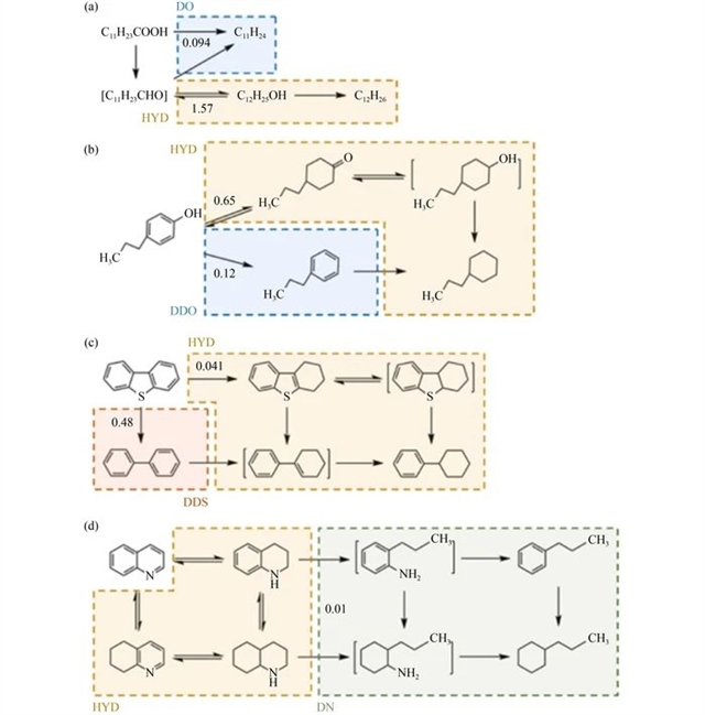 生物质原料中的含氧物种会影响石油原料加氢处理,如愈创木酚在低温下抑制加氢脱硫(HDS)反应,含氧化合物的HDO反应产物及COx会影响催化剂活性和反应进程,不同模型化合物的反应路径和速率常数表明氮的脱除是共HDT挑战之一。