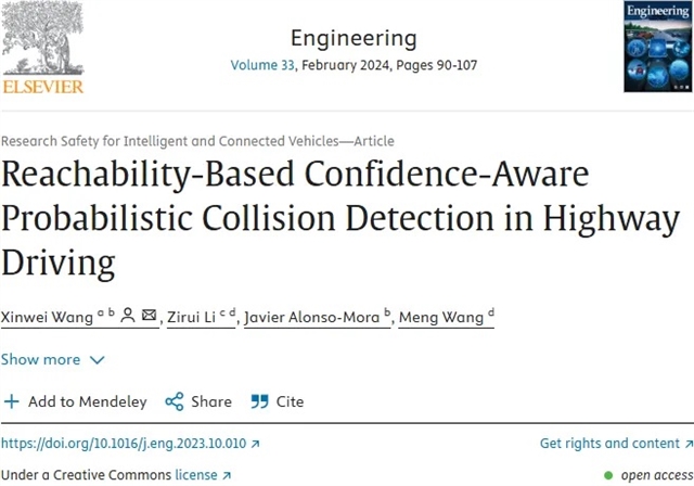 伦敦玛丽女王大学 Xinwei Wang 领衔的国际研究团队,成功研发出一种基于可达性的置信度感知概率碰撞检测框架。相关研究以 “Reachability-Based Confidence-Aware Probabilistic Collision Detection in Highway Driving”(高速公路车辆行驶中基于可达性的置信度感知概率碰撞检测)为题在中国工程院院刊《Engineering》发表。
