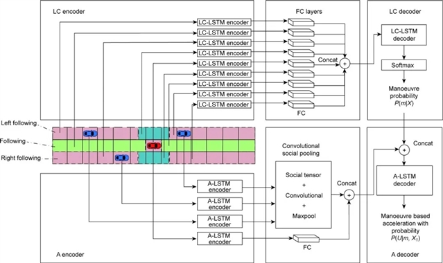图 2. 加速度预测模型概述,由变道机动预测(LC)和加速度预测(A)模块组成。这两个模块都具有编码-解码器结构,但以不同的方式采用和处理历史信息作为输入。Concat:串联操作,FC:全连接层,T-LSTM:轨迹预测模型。