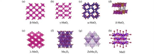 图 2 (a) β-MnO2;(b) γ-MnO2;(c) α-MnO2;(d) δ-MnO2;(e) λ-MnO2;(f)Mn3O4;(g)Mn2O4;(h)MnO