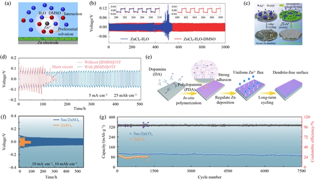 图4(a)Zn2+溶剂化结构和锌表面钝化示意图;(b)Zn||Zn对称细胞;(c)[BMIM]OTF添加剂稳定Zn沉积过程的示意图;(d)Zn||Zn对称细胞;(e)多功能PDA SEI原位形成的示意图;(f)在Sac/ZnSO4和ZnSO4电解质中测试的Zn对称电池的电压曲线;(g)使用Sac/ZnSO4和ZnSO4基电解质的Zn-MnO2全电池的循环稳定性