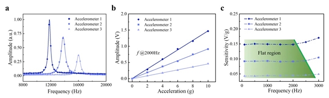 研究小组对制造出的具有三种微梁长度的微型光纤加速度计进行了振动测试。图3a为测试得到频率响应曲线。从结果中可以看出,三种加速度计的振动基模频率分别在12 kHz、14 kHz和16 kHz附近,与数值仿真值较为吻合。图3b和3c为三个加速度计的灵敏度测试结果。其中,设计为折叠式微梁的加速度计1的灵敏度约为148.61 mv/g,平坦区域带宽可以达到2 kHz。