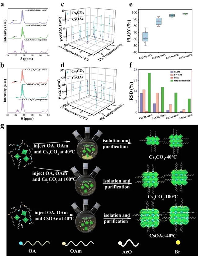 图1:使用(a)Cs2CO3和(b)CsOAc制备等浓度的饱和CsOL上清液在40和100℃下的1H NMR光谱;多个批次的量子点的(c)半峰宽、(d)发光波长和(e)PLQY的误差柱状图;(f)量子点的PLQY、FWHM、发光波长和尺寸分布的RSD图;(g)AcO-对量子点生长过程影响机制的示意图