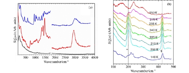 (a) 脱水HZSM-5沸石在20 K下测得的INS光谱(黑色)、293 K时丙烯吸附在该沸石中的INS光谱(红色)以及固态丙烯的INS光谱(蓝色);(b) 丙烯在140 K吸附于脱水HZSM-5中,然后依次升温至所示温度后,在20 K下测得的INS光谱