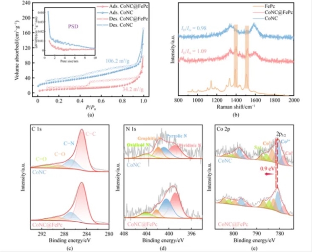 本研究采用两步法合成CoNC@FePc催化剂。首先,通过高温热解Co-ZIF前驱体获得CoNPs嵌入的氮掺杂碳基体(CoNC),其比表面积达106.2 m2/g,介孔结构有利于质量传输。随后,通过溶液浸渍法将FePc分子锚定于CoNC表面,形成了CoNPs与FePc的紧密界面。透射电镜(TEM)与球差校正高角环形暗场扫描透射电镜(AC-HAADF-STEM)表征显示,CoNC@FePc保留了前驱体的六方结构,CoNPs与FePc分子均匀分布于碳基体中。X射线光电子能谱(XPS)分析表明,FePc的引入诱导Co 2p3/2结合能正向偏移了0.9 eV,证实Co与FePc间存在显著的电荷转移,优化了活性位点的电子环境。