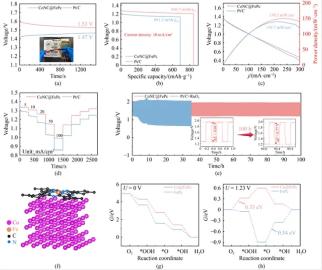 为验证其实际的应用潜力,研究人员组装了CoNC@FePc基的锌空气电池(ZAB)。结果显示,其开路电压达1.53 V,峰值功率密度为150.2 mW/cm2,较Pt/C基电池提升了7.5%。在10 mA/cm2电流密度下循环100小时后,充放电电压间隙仅增加了0.747 V,显著优于Pt/C+RuO2体系。根据密度泛函理论(DFT)计算进一步揭示了该过程的催化机制:CoNPs与FePc的界面电子转移降低了O→OH转化的能垒,使ORR速率决定步骤(RDS)能垒较纯FePc降低了39%;同时,CoNPs促进了OH→O的脱质子过程,将OER的RDS能垒从0.84 eV降至0.44 eV,揭示了双金属协同效应的原子级起源。