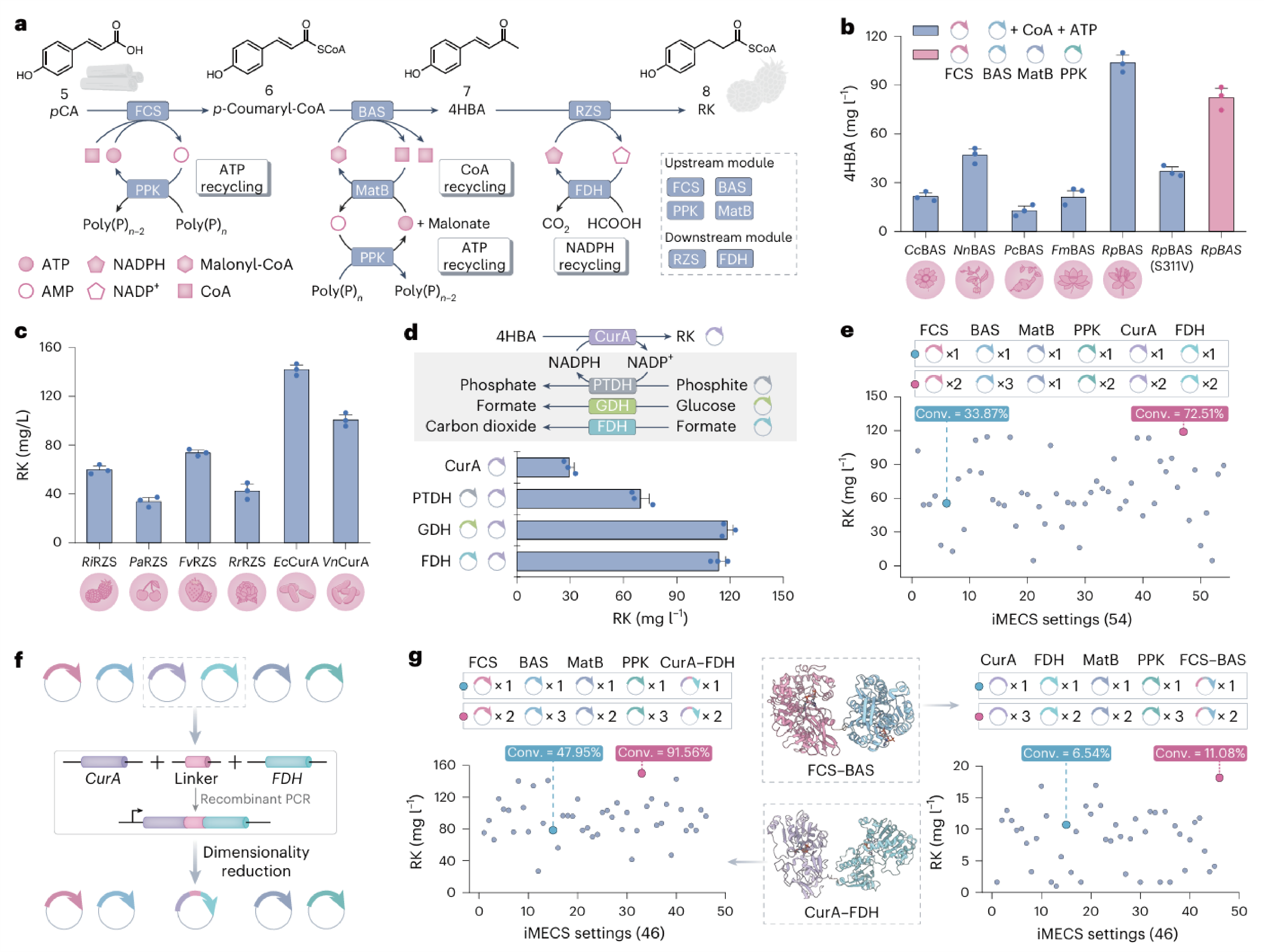 进一步,研究人员使用iMECS系统用于合成覆盆子酮(RK)。覆盆子酮是一种高附加值的天然香料,其合成路径涉及多个酶促反应和辅因子的循环再生。研究人员将合成路径分为上游模块和下游模块,能够从1 mM对香豆酸中合成103.7 mg/L的4-羟基苯甲基酮。通过引入辅因子循环再生模块,4-羟基苯甲基酮的产量达到了82.3 mg/L。最终,通过整合上游和下游模块,并优化质粒比例,iMECS系统在不添加任何外源辅因子的情况下,实现了从对香豆酸到覆盆子酮的高效合成,产量达到118.9 mg/L,转化率达到91.56%,生产力为0.15 g/L·h,相比传统方法提高了48倍。