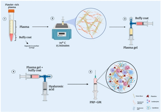 本研究聚焦于结合PRP、HA和血浆凝胶以增强组织修复和伤口愈合的新型再生疗法,提出“PRP-HA细胞凝胶基质” (PRP-GM) 方法。即把富含白细胞的PRP与加热形成的血浆凝胶、HA在注射器内经三通旋塞混合,产物含纤维蛋白-白蛋白网络等。随着纤维蛋白溶解及HA降解,PRP的细胞和生物分子逐步释放,其中白细胞促进组织再生,HA则润滑关节、抗炎止痛,这种独特的生物分子组合可能有助于优化适合治疗退行性肌肉骨骼疾病的再生方案。