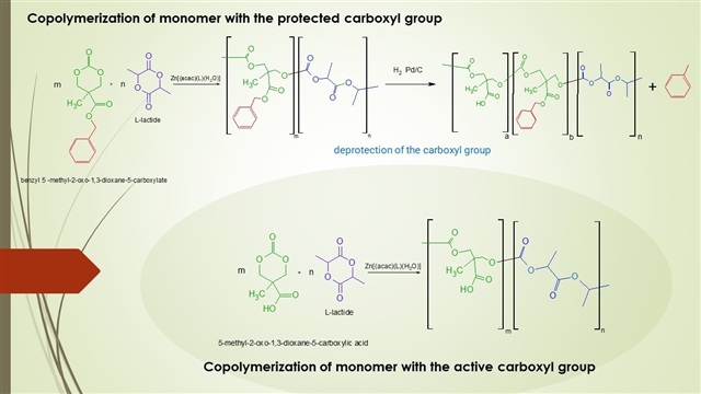 本文介绍了含侧羧基的生物可吸收功能聚酯碳酸酯的制备研究结果。这些共聚物的合成有两种方法:一种是经典的两步法,包括L-丙交酯和含有苯甲酸酯形式的封闭侧羧酸基的环状碳酸盐 (MTC-Bz) 的共聚,然后进行脱保护;另一种是新的方法,包括L-丙交酯和同样的碳酸盐的一步共聚,但含有一个无保护的羧基 (MTC-COOH)。文章详细描述了两种反应的动力学差异及其反应过程。研究发现,不含阻断基团的MTC-COOH单体的反应活性要高得多,甚至略高于L-丙交酯。这使得共聚单体在更短的时间内几乎完全转化。