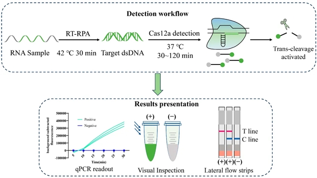 RT-RPA/CRISPR这种检测方法利用逆转录重组酶聚合酶扩增 (RT-RPA) 和CRISPR/Cas12a的检测原理。在该检测系统中,通过RT-RPA对提取的核酸中的目标基因片段进行扩增。然后,目标DNA被特异性crRNA识别,并与Cas12a形成三元复合物,顺式切割目标DNA,Cas12a无差别地反式切割ssDNA探针 (5’-FAM-TTATT-3’-BHQ1-标记) 或 (5’-FAM-TTATT-3’-生物素标记) 在反应系统中。检测结果以荧光值、蓝光、侧流试纸条三种方式呈现。