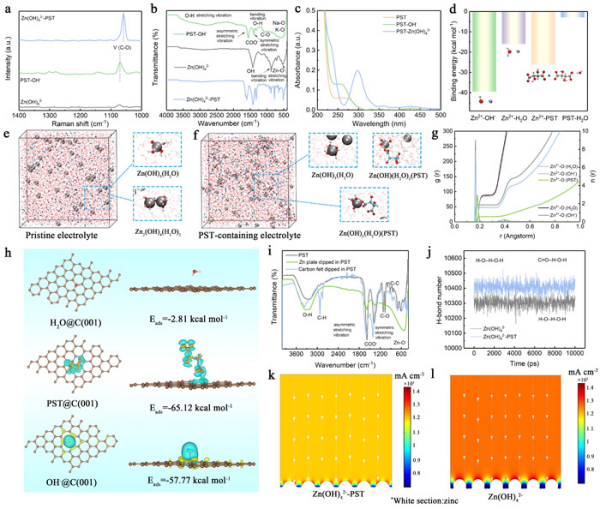 该研究在设计高电压锌碘液流电池基础上,通过在碱性锌负极添加同时具备含氧功能性官能团及电荷载体的酒石酸钾钠,实现了对电解液离子结构-电极界面传质行为的有效调控,电池输出功率密度达到616 mW cm−2,有效提升22.8%,并在140 mA cm−2电密运行下实现71.5%的能量转换效率。更重要的是,2.5 M高浓度电解液可在120 mA cm−2下有效提升容量及能量密度至105.98 Ah L−1和185.18 Wh L−1。材料表征结果表明,酒石酸钾钠显著调控了锌离子的原始配位平衡,加速了脱溶剂化过程。同时,酒石酸钾钠在电极表面优先吸附形成屏蔽层,均匀诱导锌离子迁移通量,优化了电流密度分布,克服了枝晶生长及死锌累积的缺陷。此外,酒石酸钾钠通过氢键相互作用破坏了水分子间的原始氢键网络,减少了电解液中自由水的数量,显著抑制了析氢副反应。