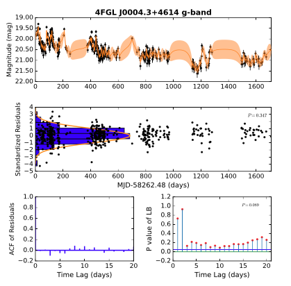 图1 高斯过程中阻尼随机游走模型拟合光学光变曲线及其拟合效果评估