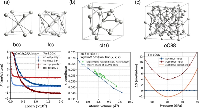 锂原子质量很轻,因此由单质锂形成的固体结构表现出显著的核量子效应。在低压条件下,锂具有高对称的立方结构,但取决于具体温压条件,锂或表现出体心立方(bcc)和面心立方(fcc)结构;在高压条件下,锂则表现出更复杂的晶体结构,如每元胞可包含16甚至88个原子的cI16和oC88。由于这些结构自由能差微小,因此如何精准处理非简谐核量子效应和有限温效应,以正确预言单质锂的物态亟待探讨。