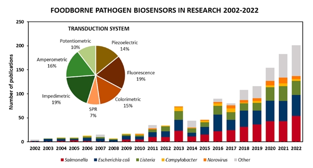 图2 2002-2022年期间发表的关于生物传感器检测食源性病原体的文章。通过将2002 - 2022年Scopus中“食源性病原体检测”和同义词作为关键词的文章搜索限制在生物传感器范围内,然后根据目标食源性病原体和转导技术对1167篇文章进行分类,得到的值。