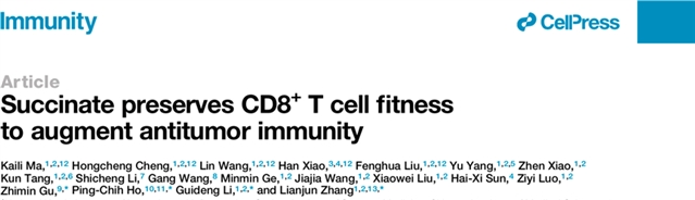 2025年8月14日,中国医学科学院系统医学研究院/苏州系统医学研究所(以下简称“系统所”)张连军团队、李贵登团队、顾志敏团队与瑞士洛桑大学Ping-Chih Ho团队合作在Immunity期刊在线发表题为“Succinate preserves CD8+ T cell fitness to augment anti-tumor immunity”的研究论文。该研究发现三羧酸循环代谢中间物琥珀酸,可通过激活线粒体自噬与表观遗传重塑,显著增强CD8+ T细胞存活、干性维持及持久抗肿瘤能力,为提升免疫治疗疗效提供了全新的代谢干预靶点。