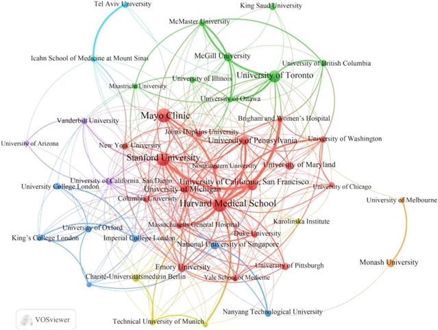 研究结果显示,2014至2024年间,医学数字与智能教育领域的出版物数量呈稳步增长态势,2022至2024年更是显著激增,2024年达到峰值,这反映出全球对此领域的兴趣与日俱增,其驱动力源于技术进步,新冠疫情也在一定程度上产生了影响。美国在出版物数量、被引次数和中心性方面均居首位,中国、英国等紧随其后。在机构层面,哈佛医学院和梅奥诊所表现突出。