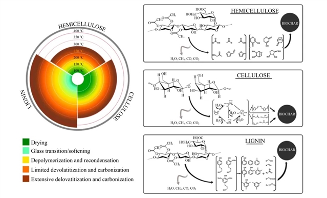 热解是将木质纤维素材料在高温下无氧加热的过程,是气化和燃烧的初始阶段。热解过程中,热量从外部产生并通过传导、对流和热辐射传递到反应器中的生物质。热解产生富含碳的固体材料生物炭,以及可冷凝和不可冷凝的挥发性副产物。