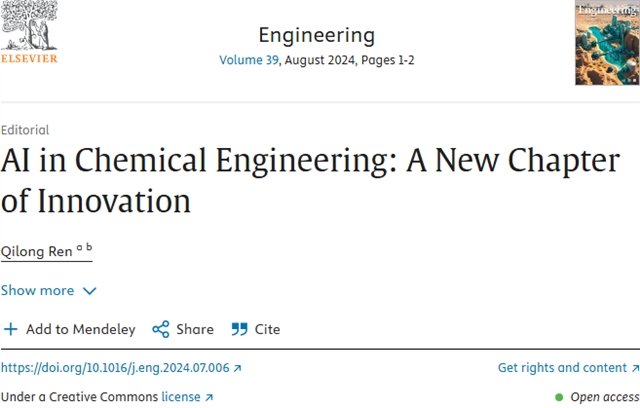 Qilong Ren. AI in Chemical Engineering: A New Chapter of Innovation. Engineering, 2024, 39(8): 1–2 https://doi.org/10.1016/j.eng.2024.07.006