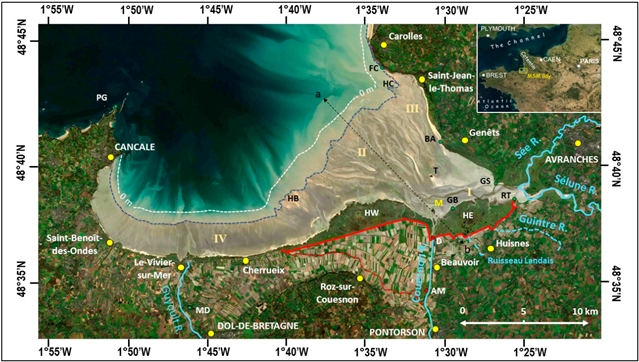 潮间带是受潮汐影响的低坡度海岸带广泛存在的形态和生态系统,具有重要的环境敏感性。法国圣米歇尔山海湾作为世界闻名的潮汐海湾,不仅拥有独特的中世纪修道院景观,还面临着严重的泥沙淤积问题。过去两个世纪的人类活动加剧了海湾淤积,导致圣米歇尔山逐渐被扩张的盐沼包围。为恢复其"海岛特性",2007-2015年间实施了包括新建水坝、开挖河道和拆除旧堤道在内的大型工程。来自法国兰斯大学的Jean-Paul Deroin教授在GeoHazards期刊发表文章,利用2000-2023年间多源卫星影像数据,评估了这些工程对海湾水动力和沉积过程的实际影响。研究旨在回答这些工程措施是否有效阻止了山体周围的淤积趋势。