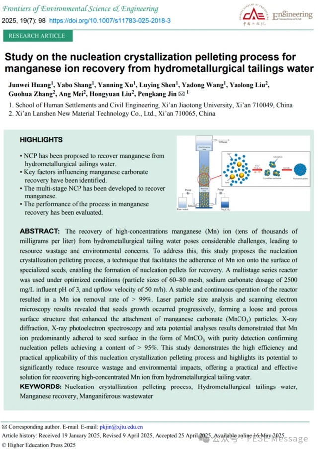 本文内容来自FESE期刊2025年第19卷第7期发表的研究文章“Study on the nucleation crystallization pelleting process for manganese ion recovery from hydrometallurgical tailings water”。通讯作者为西安交通大学人居环境与土木工程学院金鹏康教授。